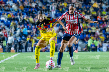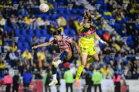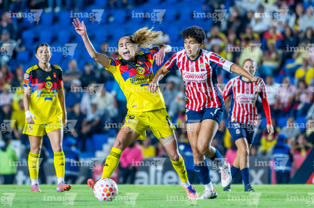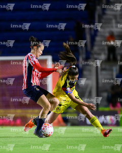 Ciudad de México, 16 de noviembre de 2025. Jana Gutiérrez y Denise Castro, durante el partido correspondiente a la vuelta de las Semifinales del torneo Apertura 2025 de la Liga BBVA MX Femenil, entre las Águilas del América y las Chivas Rayadas del Guadalajara, realizado en el estadio Ciudad de los Deportes. Foto: Imago7/ Mauricio Ruiz