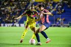 Ciudad de México, 16 de noviembre de 2025. Joselyn De La Rosa y Nicolette Hernández, durante el partido correspondiente a la vuelta de las Semifinales del torneo Apertura 2025 de la Liga BBVA MX Femenil, entre las Águilas del América y las Chivas Rayadas del Guadalajara, realizado en el estadio Ciudad de los Deportes. Foto: Imago7/ Carlos Vargas