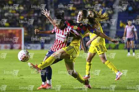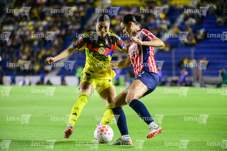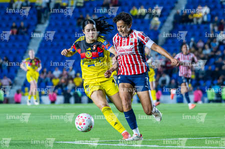 Ciudad de México, 16 de noviembre de 2025. Nicolette Hernández y Gabriela Valenzuela, durante el partido correspondiente a la vuelta de las Semifinales del torneo Apertura 2025 de la Liga BBVA MX Femenil, entre las Águilas del América y las Chivas Rayadas del Guadalajara, realizado en el estadio Ciudad de los Deportes. Foto: Imago7/ Alexis Chavez
