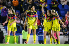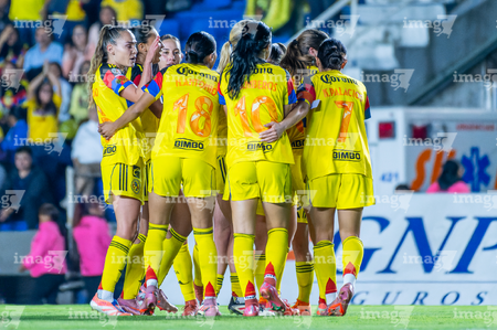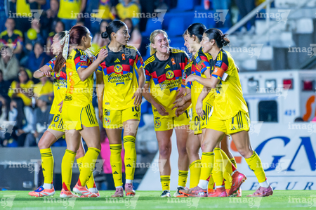 Ciudad de México, 16 de noviembre de 2025. Jugadoras del América femenil en festejo de gol, durante el partido correspondiente a la vuelta de las Semifinales del torneo Apertura 2025 de la Liga BBVA MX Femenil, entre las Águilas del América y las Chivas Rayadas del Guadalajara, realizado en el estadio Ciudad de los Deportes. Foto: Imago7/ Mauricio Ruiz