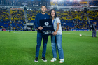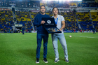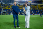Ciudad de México, 16 de noviembre de 2025. Luis Fuentes entregó un reconocimiento a Vanesa Paredes, durante el partido correspondiente a la vuelta de las Semifinales del torneo Apertura 2025 de la Liga BBVA MX Femenil, entre las Águilas del América y las Chivas Rayadas del Guadalajara, realizado en el estadio Ciudad de los Deportes. Foto: Imago7/