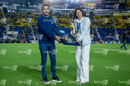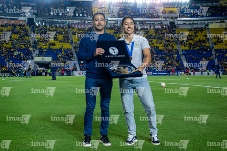 Ciudad de México, 16 de noviembre de 2025. Luis Fuentes entregó un reconocimiento a Valentina Murrieta, durante el partido correspondiente a la vuelta de las Semifinales del torneo Apertura 2025 de la Liga BBVA MX Femenil, entre las Águilas del América y las Chivas Rayadas del Guadalajara, realizado en el estadio Ciudad de los Deportes. Foto: Imago7/