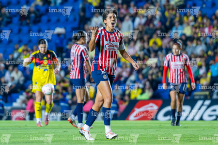 Ciudad de México, 16 de noviembre de 2025. Casandra Montero en reclamo, durante el partido correspondiente a la vuelta de las Semifinales del torneo Apertura 2025 de la Liga BBVA MX Femenil, entre las Águilas del América y las Chivas Rayadas del Guadalajara, realizado en el estadio Ciudad de los Deportes. Foto: Imago7/ Mauricio Ruiz