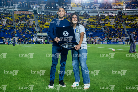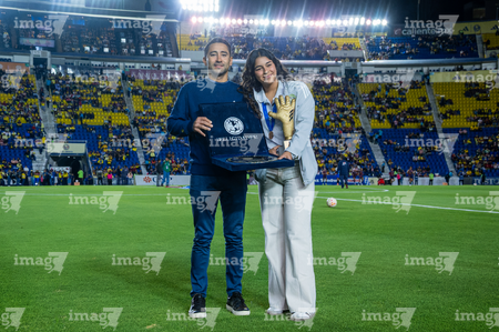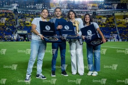 Ciudad de México, 16 de noviembre de 2025. Luis Fuentes entregó un reconocimiento a Bárbara Del Real, durante el partido correspondiente a la vuelta de las Semifinales del torneo Apertura 2025 de la Liga BBVA MX Femenil, entre las Águilas del América y las Chivas Rayadas del Guadalajara, realizado en el estadio Ciudad de los Deportes. Foto: Imago7/