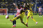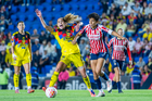 Ciudad de México, 16 de noviembre de 2025. Scarlett Camberos y Casandra Montero, durante el partido correspondiente a la vuelta de las Semifinales del torneo Apertura 2025 de la Liga BBVA MX Femenil, entre las Águilas del América y las Chivas Rayadas del Guadalajara, realizado en el estadio Ciudad de los Deportes. Foto: Imago7/ Mauricio Ruiz