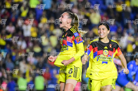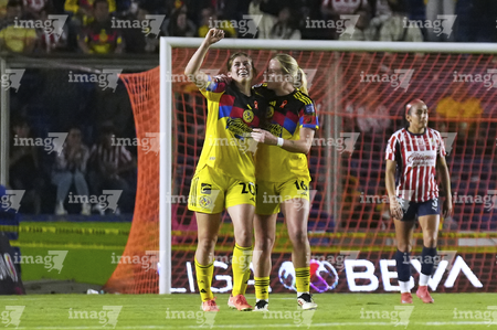 Ciudad de México, 16 de noviembre de 2025. Nicolette Hernández y Annie Karich en festejo de gol, durante el partido correspondiente a la vuelta de las Semifinales del torneo Apertura 2025 de la Liga BBVA MX Femenil, entre las Águilas del América y las Chivas Rayadas del Guadalajara, realizado en el estadio Ciudad de los Deportes. Foto: Imago7/ Carlos Vargas