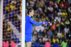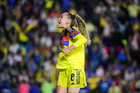 Ciudad de México, 16 de noviembre de 2025. Carolina Jaramillo en lamento, durante el partido correspondiente a la vuelta de las Semifinales del torneo Apertura 2025 de la Liga BBVA MX Femenil, entre las Águilas del América y las Chivas Rayadas del Guadalajara, realizado en el estadio Ciudad de los Deportes. Foto: Imago7/ Mauricio Ruiz