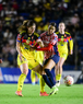 Ciudad de México, 16 de noviembre de 2025. Carolina Jaramillo y Nancy Antonio, durante el partido correspondiente a la vuelta de las Semifinales del torneo Apertura 2025 de la Liga BBVA MX Femenil, entre las Águilas del América y las Chivas Rayadas del Guadalajara, realizado en el estadio Ciudad de los Deportes. Foto: Imago7/ Carlos Vargas