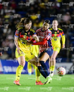 Ciudad de México, 16 de noviembre de 2025. Annie Karich y Viridiana Salazar durante el partido correspondiente a la vuelta de las Semifinales del torneo Apertura 2025 de la Liga BBVA MX Femenil, entre las Águilas del América y las Chivas Rayadas del Guadalajara, realizado en el estadio Ciudad de los Deportes. Foto: Imago7/ Mauricio Ruiz