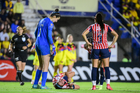 Ciudad de México, 16 de noviembre de 2025. Daniela Delgado resultó lesionada, durante el partido correspondiente a la vuelta de las Semifinales del torneo Apertura 2025 de la Liga BBVA MX Femenil, entre las Águilas del América y las Chivas Rayadas del Guadalajara, realizado en el estadio Ciudad de los Deportes. Foto: Imago7/ Alexis Chavez