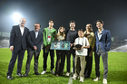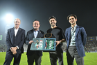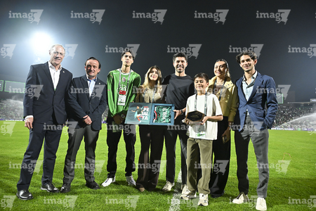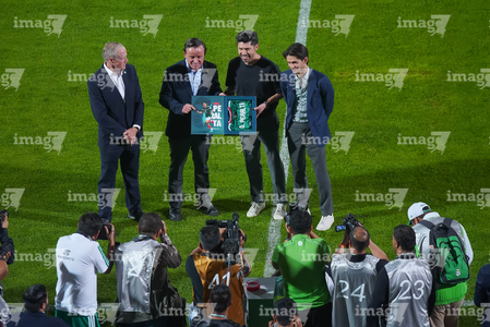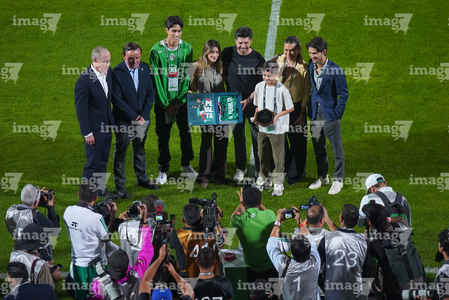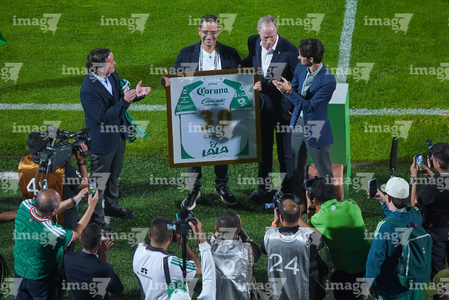 Torreón, Coahuila, 15 de noviembre de 2025. Gustavo Mendoza recibió un reconocimiento de Mikel Arriola, Ivar Sisniega y Alejandro Irarragorri Kalb, durante un partido amistoso del MEXTOUR 2025, entre la Selección Nacional de México y la Selección de Uruguay, realizado en el estadio Corona. Foto: Imago7/ Erick Saavedra