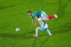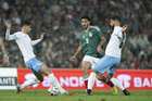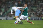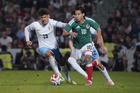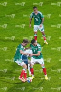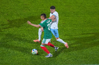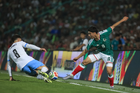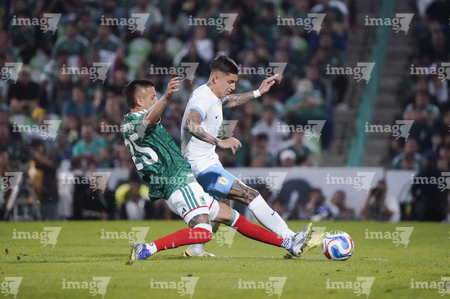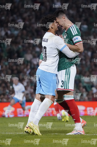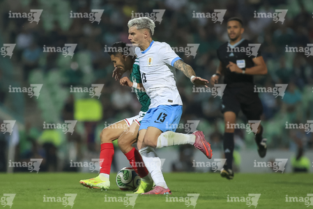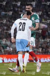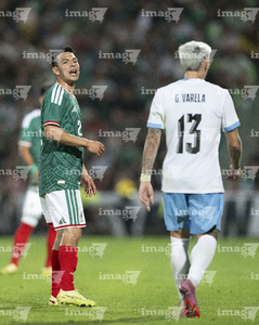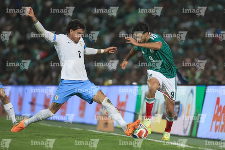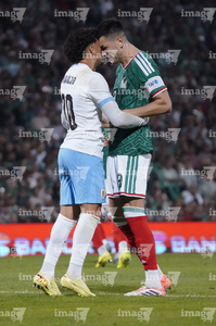 Torreón, Coahuila, 15 de noviembre de 2025. Roberto Alvarado "Piojo" y Joaquín Piquerez, durante un partido amistoso del MEXTOUR 2025, entre la Selección Nacional de México y la Selección de Uruguay, realizado en el estadio Corona. Foto: Imago7/ Erick Saavedra