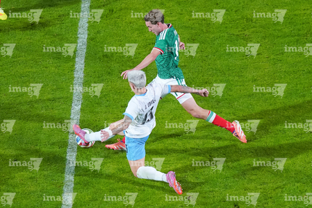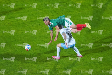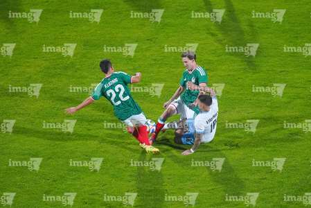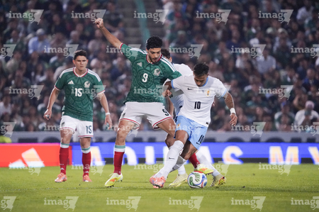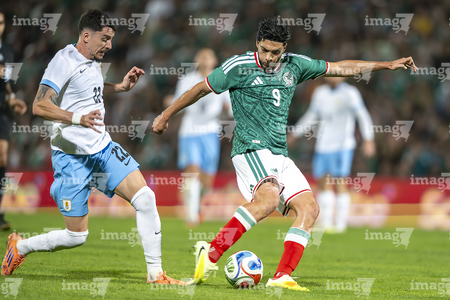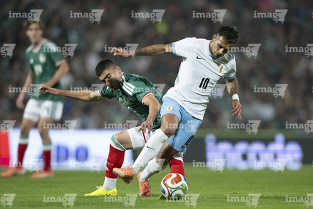Torreón, Coahuila, 15 de noviembre de 2025. Rodrigo Aguirre y Erik Lira, durante un partido amistoso del MEXTOUR 2025, entre la Selección Nacional de México y la Selección de Uruguay, realizado en el estadio Corona. Foto: Imago7/ Erick Saavedra