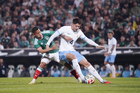 Torreón, Coahuila, 15 de noviembre de 2025. Raúl Jiménez (C) y Rodrigo Bentancur (D), durante el partido de preparación del MEXTOUR 2025, entre la Selección Nacional de México y la Selección de Uruguay, realizado en el estadio Corona. Foto: Imago7/ Etzel Espinosa