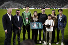 Torreón, Coahuila, 15 de noviembre de 2025. Oribe Peralta recibió un reconocimiento de Mikel Arriola, Ivar Sisniega y Alejandro Irarragorri Kalb, durante el partido de preparación del MEXTOUR 2025, entre la Selección Nacional de México y la Selección de Uruguay, realizado en el estadio Corona. Foto: Imago7/ Etzel Espinosa