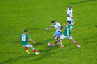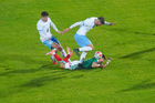 Torreón, Coahuila, 15 de noviembre de 2025. Maximiliano Araújo y César Montes "Cachorro" en conato de bronca, durante un partido amistoso del MEXTOUR 2025, entre la Selección Nacional de México y la Selección de Uruguay, realizado en el estadio Corona. Foto: Imago7/Sebastian Laureano Miranda