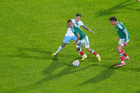 Torreón, Coahuila, 15 de noviembre de 2025. Marcel Ruiz, Brian Rodríguez y Hirving Lozano "Chucky", durante el partido de preparación del MEXTOUR 2025, entre la Selección Nacional de México y la Selección de Uruguay, realizado en el estadio Corona. Foto: Imago7/ Etzel Espinosa