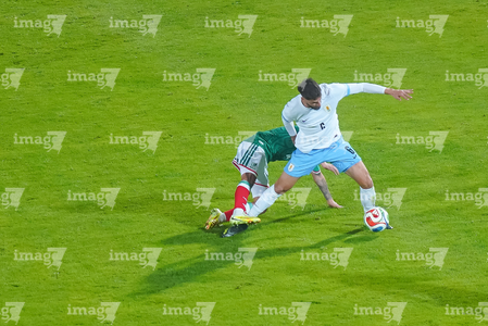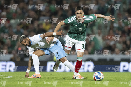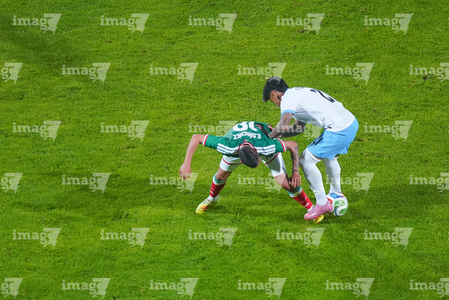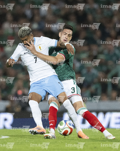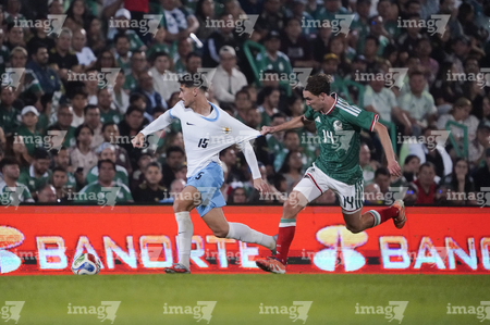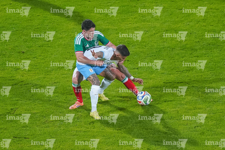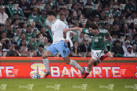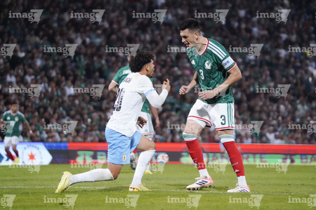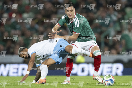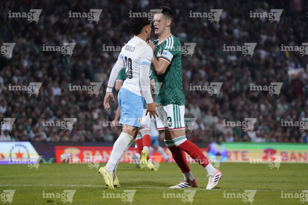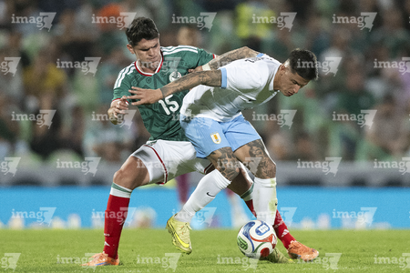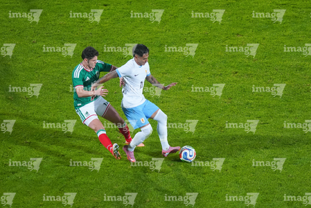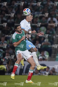 Torreón, Coahuila, 15 de noviembre de 2025. Rodrigo Zalazar y Johan Vásquez, durante el partido de preparación del MEXTOUR 2025, entre la Selección Nacional de México y la Selección de Uruguay, realizado en el estadio Corona. Foto: Imago7/