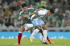 Torreón, Coahuila, 15 de noviembre de 2025. Roberto Alvarado "Piojo" y Brian Rodríguez, durante un partido amistoso del MEXTOUR 2025, entre la Selección Nacional de México y la Selección de Uruguay, realizado en el estadio Corona. Foto: Imago7/Sebastian Laureano Miranda