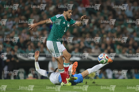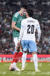 Torreón, Coahuila, 15 de noviembre de 2025. Roberto Alvarado "Piojo" y Maxi Araujo, durante el partido de preparación del MEXTOUR 2025, entre la Selección Nacional de México y la Selección de Uruguay, realizado en el estadio Corona. Foto: Imago7/ Etzel Espinosa