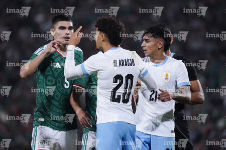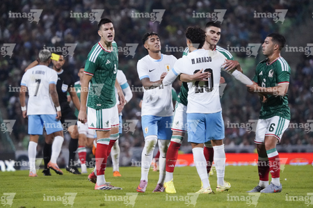 Torreón, Coahuila, 15 de noviembre de 2025. Maximiliano Araújo y César Montes "Cachorro" en conato de bronca, durante un partido amistoso del MEXTOUR 2025, entre la Selección Nacional de México y la Selección de Uruguay, realizado en el estadio Corona. Foto: Imago7/ Erick Saavedra