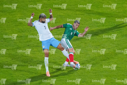 Torreón, Coahuila, 15 de noviembre de 2025. Hirving Lozano "Chucky" y Guillermo Varela, durante un partido amistoso del MEXTOUR 2025, entre la Selección Nacional de México y la Selección de Uruguay, realizado en el estadio Corona. Foto: Imago7/ Erick Saavedra