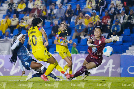 Ciudad de México, 18 de septiembre de 2025. Esthefanny Barreras ataja balón, durante el partido de fase de grupos del Grupo A de la Concacaf W Champions Cup 2025-2026, entre las Águilas del América y las Tuzas del Pachuca, realizado en el estadio Ciudad de los Deportes. Foto: Imago7 / Diego Padilla