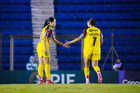 Ciudad de México, 18 de septiembre de 2025. Daniela Flores y Kiana Palacios, durante el partido de fase de grupos del Grupo A de la Concacaf W Champions Cup 2025-2026, entre las Águilas del América y las Tuzas del Pachuca, realizado en el estadio Ciudad de los Deportes. Foto: Imago7 / Manlio Contreras