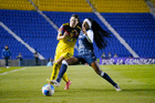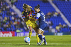 Ciudad de México, 18 de septiembre de 2025. Nancy Antonio y Nina Nicosia, durante el partido de fase de grupos del Grupo A de la Concacaf W Champions Cup 2025-2026, entre las Águilas del América y las Tuzas del Pachuca, realizado en el estadio Ciudad de los Deportes. Foto: Imago7 / Diego Padilla