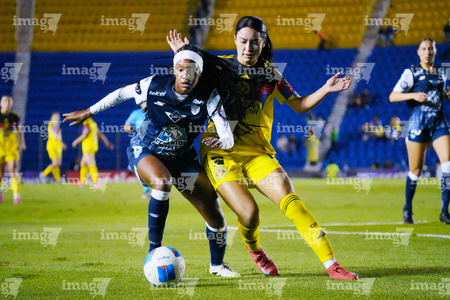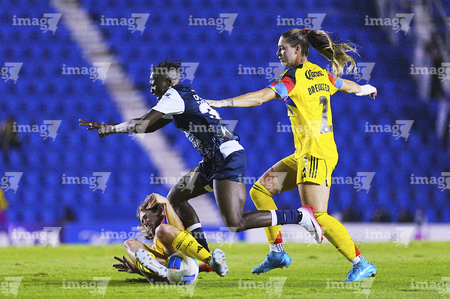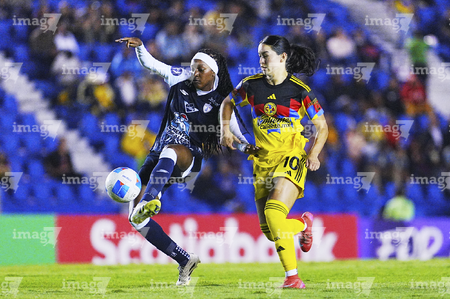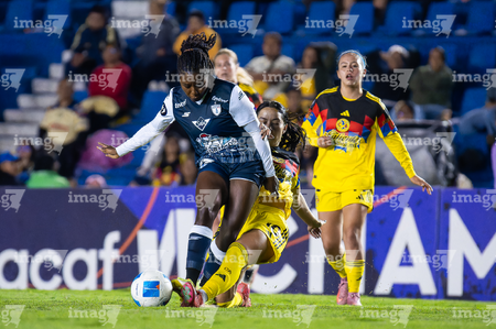 Ciudad de México, 18 de septiembre de 2025. Ayooluwa Oke y Scarlett Camberos, durante el partido de fase de grupos del Grupo A de la Concacaf W Champions Cup 2025-2026, entre las Águilas del América y las Tuzas del Pachuca, realizado en el estadio Ciudad de los Deportes. Foto: Imago7 / Diego Padilla