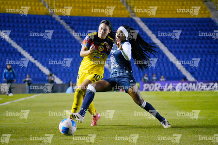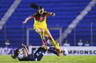 Ciudad de México, 18 de septiembre de 2025. Yirleidis Quejada y Scarlett Camberos, durante el partido de fase de grupos del Grupo A de la Concacaf W Champions Cup 2025-2026, entre las Águilas del América y las Tuzas del Pachuca, realizado en el estadio Ciudad de los Deportes. Foto: Imago7 / Diego Padilla