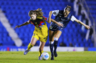 Ciudad de México, 18 de septiembre de 2025. Yirleidis Quejada y Scarlett Camberos, durante el partido de fase de grupos del Grupo A de la Concacaf W Champions Cup 2025-2026, entre las Águilas del América y las Tuzas del Pachuca, realizado en el estadio Ciudad de los Deportes. Foto: Imago7 / Manlio Contreras