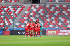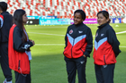 Toluca, Estado de México, 5 de enero de 2026. Jugadoras de Xolas, durante el partido correspondiente a la jornada 1 del torneo Clausura 2026 de la Liga BBVA MX Femenil, entre las Diablas Rojas del Toluca y las Xolas de Tijuana, realizado en el estadio Nemesio Diez. Foto: Imago7/ Jesús Esquivel