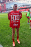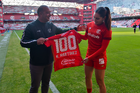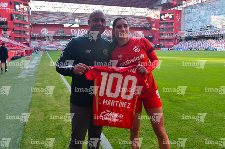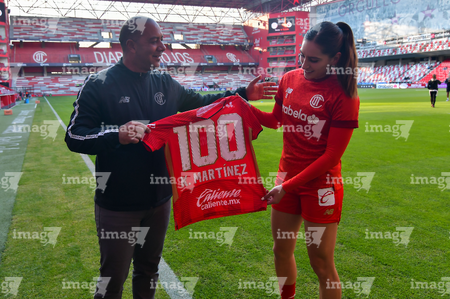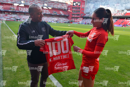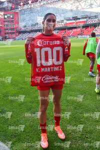 Toluca, Estado de México, 5 de enero de 2026. Karla Martínez recibió un reconocimiento por 100 partidos, durante el partido correspondiente a la jornada 1 del torneo Clausura 2026 de la Liga BBVA MX Femenil, entre las Diablas Rojas del Toluca y las Xolas de Tijuana, realizado en el estadio Nemesio Diez. Foto: Imago7/ Arturo Hernández