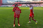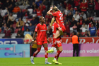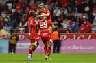 Toluca, Estado de México, 5 de enero de 2026. Faustine Robert y Eugenie Le Sommer en festejo de gol, durante el partido correspondiente a la jornada 1 del torneo Clausura 2026 de la Liga BBVA MX Femenil, entre las Diablas Rojas del Toluca y las Xolas de Tijuana, realizado en el estadio Nemesio Diez. Foto: Imago7/Daniel Arriaga