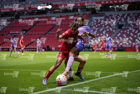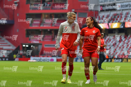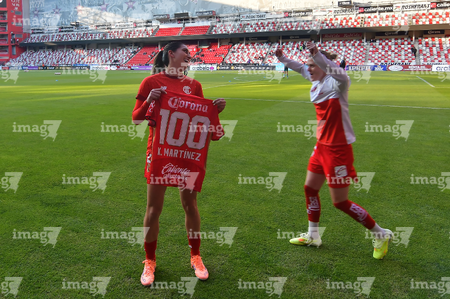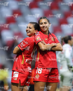 Toluca, Estado de México, 5 de enero de 2026. Karla Martínez y Dana Sandoval, durante el partido correspondiente a la jornada 1 del torneo Clausura 2026 de la Liga BBVA MX Femenil, entre las Diablas Rojas del Toluca y las Xolas de Tijuana, realizado en el estadio Nemesio Diez. Foto: Imago7/ Arturo Hernández