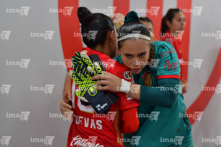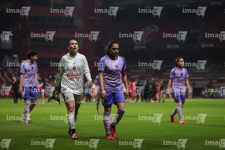 Toluca, Estado de México, 5 de enero de 2026. Casandra Cuevas y Valeria Martínez, durante el partido correspondiente a la jornada 1 del torneo Clausura 2026 de la Liga BBVA MX Femenil, entre las Diablas Rojas del Toluca y las Xolas de Tijuana, realizado en el estadio Nemesio Diez. Foto: Imago7/ Arturo Hernández