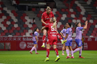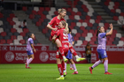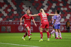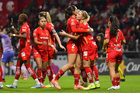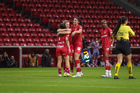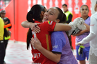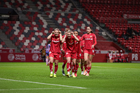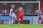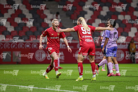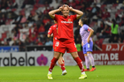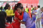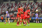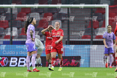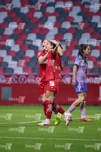 Toluca, Estado de México, 5 de enero de 2026. Ana Gaby Paz recibe gol, durante el partido correspondiente a la jornada 1 del torneo Clausura 2026 de la Liga BBVA MX Femenil, entre las Diablas Rojas del Toluca y las Xolas de Tijuana, realizado en el estadio Nemesio Diez. Foto: Imago7/Daniel Arriaga