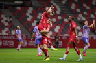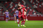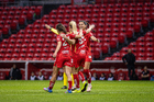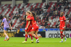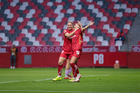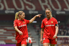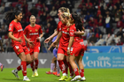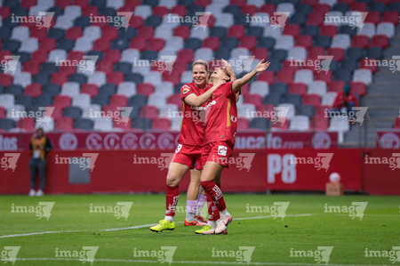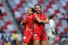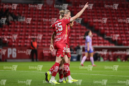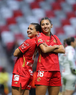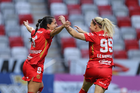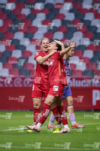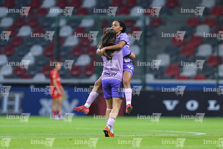 Toluca, Estado de México, 5 de enero de 2026. Kayla Fernandez y Eugenie Le Sommer en festejo de gol, durante el partido correspondiente a la jornada 1 del torneo Clausura 2026 de la Liga BBVA MX Femenil, entre las Diablas Rojas del Toluca y las Xolas de Tijuana, realizado en el estadio Nemesio Diez. Foto: Imago7/ Jesús Esquivel
