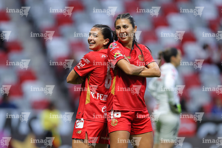 Toluca, Estado de México, 5 de enero de 2026. Michel Fong y Dana Sandoval en festejo de gol, durante el partido correspondiente a la jornada 1 del torneo Clausura 2026 de la Liga BBVA MX Femenil, entre las Diablas Rojas del Toluca y las Xolas de Tijuana, realizado en el estadio Nemesio Diez. Foto: Imago7/ Jesús Esquivel