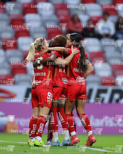 Toluca, Estado de México, 5 de enero de 2026. Jugadoras del Toluca femenil en festejo de gol, durante el partido correspondiente a la jornada 1 del torneo Clausura 2026 de la Liga BBVA MX Femenil, entre las Diablas Rojas del Toluca y las Xolas de Tijuana, realizado en el estadio Nemesio Diez. Foto: Imago7/Daniel Arriaga