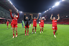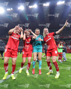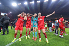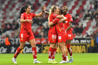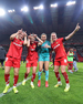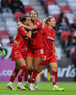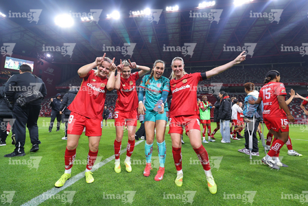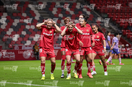 Toluca, Estado de México, 5 de enero de 2026. Eugenie Le Sommer, Faustine Robert, Valeria Martínez y Amandine Henry en festejo, durante el partido correspondiente a la jornada 1 del torneo Clausura 2026 de la Liga BBVA MX Femenil, entre las Diablas Rojas del Toluca y las Xolas de Tijuana, realizado en el estadio Nemesio Diez. Foto: Imago7/ Jesús Esquivel