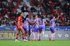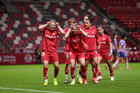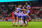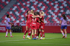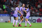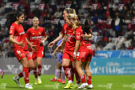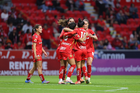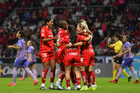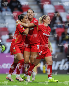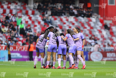 Toluca, Estado de México, 5 de enero de 2026. Jugadoras de Xolas en festejo de gol, durante el partido correspondiente a la jornada 1 del torneo Clausura 2026 de la Liga BBVA MX Femenil, entre las Diablas Rojas del Toluca y las Xolas de Tijuana, realizado en el estadio Nemesio Diez. Foto: Imago7/ Jesús Esquivel