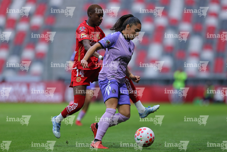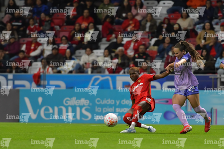 Toluca, Estado de México, 5 de enero de 2026. Amogelang Motau y Inglis Hernández, durante el partido correspondiente a la jornada 1 del torneo Clausura 2026 de la Liga BBVA MX Femenil, entre las Diablas Rojas del Toluca y las Xolas de Tijuana, realizado en el estadio Nemesio Diez. Foto: Imago7/ Arturo Hernández
