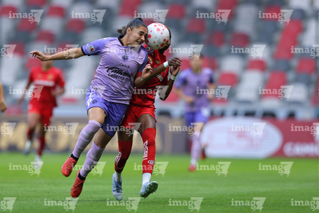 Toluca, Estado de México, 5 de enero de 2026. Faustine Robert y Bibiana Quintos, durante el partido correspondiente a la jornada 1 del torneo Clausura 2026 de la Liga BBVA MX Femenil, entre las Diablas Rojas del Toluca y las Xolas de Tijuana, realizado en el estadio Nemesio Diez. Foto: Imago7/ Arturo Hernández