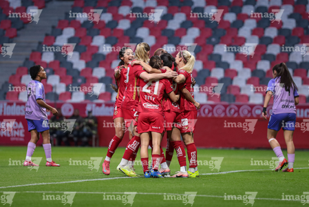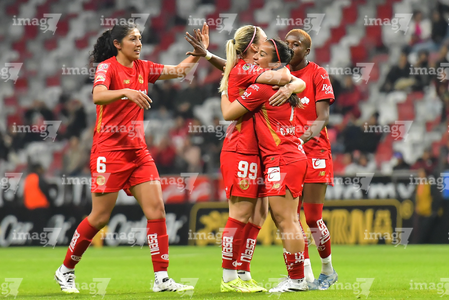 Toluca, Estado de México, 5 de enero de 2026. Jugadoras del Toluca femenil en festejo de gol, durante el partido correspondiente a la jornada 1 del torneo Clausura 2026 de la Liga BBVA MX Femenil, entre las Diablas Rojas del Toluca y las Xolas de Tijuana, realizado en el estadio Nemesio Diez. Foto: Imago7/ Jesús Esquivel