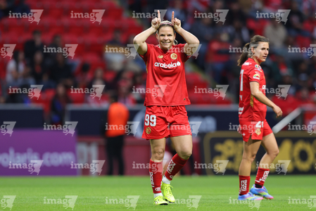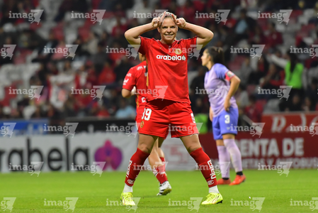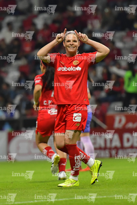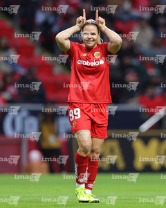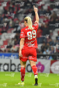 Toluca, Estado de México, 5 de enero de 2026. Eugenie Le Sommer en festejo de gol, durante el partido correspondiente a la jornada 1 del torneo Clausura 2026 de la Liga BBVA MX Femenil, entre las Diablas Rojas del Toluca y las Xolas de Tijuana, realizado en el estadio Nemesio Diez. Foto: Imago7/ Arturo Hernández