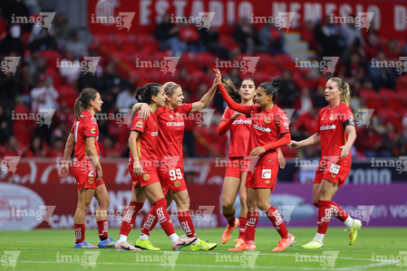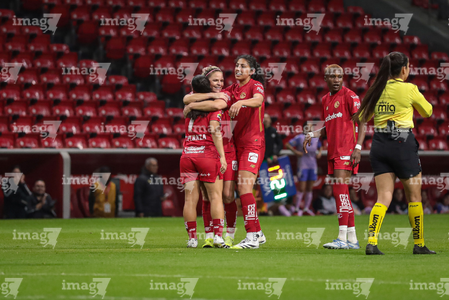 Toluca, Estado de México, 5 de enero de 2026. Jugadoras del Toluca femenil en festejo, durante el partido correspondiente a la jornada 1 del torneo Clausura 2026 de la Liga BBVA MX Femenil, entre las Diablas Rojas del Toluca y las Xolas de Tijuana, realizado en el estadio Nemesio Diez. Foto: Imago7/ Jesús Esquivel