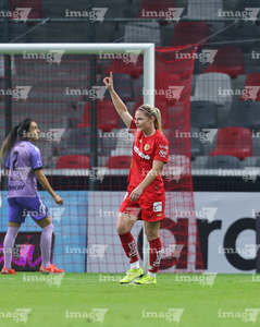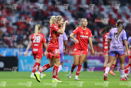 Toluca, Estado de México, 5 de enero de 2026. Kayla Fernandez en festejo de gol, durante el partido correspondiente a la jornada 1 del torneo Clausura 2026 de la Liga BBVA MX Femenil, entre las Diablas Rojas del Toluca y las Xolas de Tijuana, realizado en el estadio Nemesio Diez. Foto: Imago7/ Jesús Esquivel