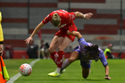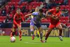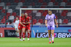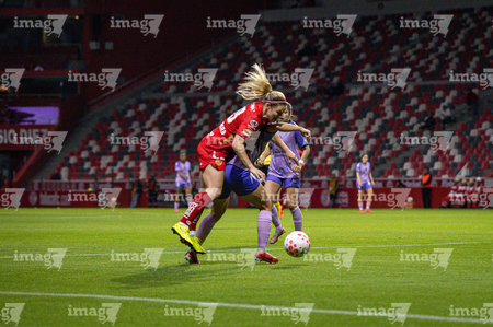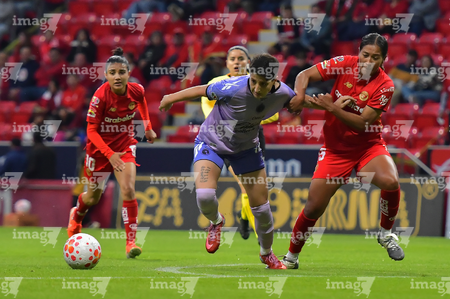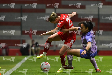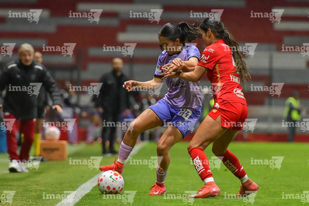 Toluca, Estado de México, 5 de enero de 2026. Victoria López y Michel Fong, durante el partido correspondiente a la jornada 1 del torneo Clausura 2026 de la Liga BBVA MX Femenil, entre las Diablas Rojas del Toluca y las Xolas de Tijuana, realizado en el estadio Nemesio Diez. Foto: Imago7/ Arturo Hernández